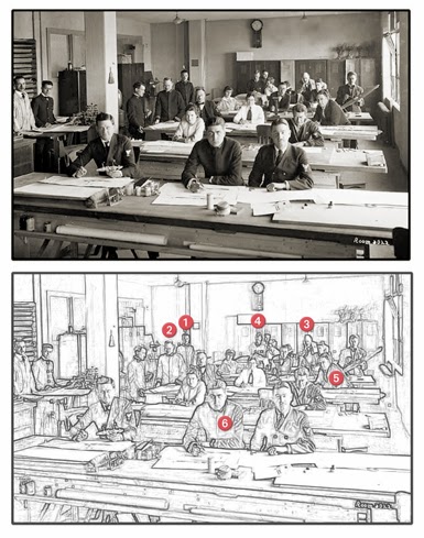 Above This is a rare World War 1-era photograph (c1918) of the drafting room at the Design Subsection of the US Navy's Camouflage Section. This art-centered subsection (under the direction of artist Everett L. Warner) was located in Washington DC, while a second science-centered Research Subsection (under the direction of optical physiologist Loyd A. Jones) was at the Eastman Kodak research facility in Rochester NY. The executive officer in charge of the combined subsections (the Camouflage Section per se) was architect (and Olympic fencing champion) Harold Van Buskirk. Through extensive searches (in part thanks to notes received from the descendants of the camoufleurs), we've been able to identify more of these individuals and to learn about their lives. In this photograph, as indicated by numbers, we have identified Harold Van Buskirk (1), Everett Warner (2), painter Frederick J. Waugh (3) (seated to the right of him is sculptor John Gregory), painter Gordon Stevenson (4), painter Manley K. Nash (5) (standing behind and right of him, holding a large ship model, is Kenneth Stevens MacIntire), and architect Raymond J. Richardson (6), who was in charge of the drafting room. It is not surprising that two of the supervisory personnel (Van Buskirk and Richardson) were architects, because it was often claimed that the best camouflage officers were not artists but architects, because of their experience in working collaboratively. Note also the inclusion of women (an innovation at the time), four or five of whom are in this group.